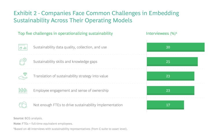 Several common challenges stood out in our survey and interviews, regardless of which industry the respondents worked in or how big their companies were. (See Exhibit 2.) Topping the list is the difficulty of collecting and using high-quality ESG data. Almost as challenging is the change effort required to develop a baseline understanding of sustainability across the firm and to convince all stakeholders that sustainability is a value opportunity and not just a cost driver.