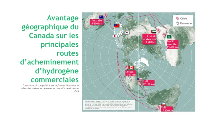 Le Canada a le potentiel d’être un des principaux fournisseurs d’hydrogène bleu. La Colombie-Britannique et l’Alberta possèdent de vastes ressources de gaz naturel (représentant plus de 200 ans de la valeur de production actuelle) à faible coût, un vaste espace de stockage géologique pour le dioxyde de carbone près des centrales industrielles, ainsi qu’un savoir-faire technique à la fine pointe mondiale en matière de piégeage du carbone. Un autre atout est la proximité du Canada avec les principaux pays importateurs : à partir de sa côte Ouest, le Canada peut expédier de l’hydrogène vers l’Asie du Nord-Est à la moitié du coût de ses concurrents américains et du Moyen-Orient. Et en ces temps où la sécurité énergétique ne cesse de gagner en importance, le Canada est un fournisseur de confiance dont les produits évitent les goulets d’étranglement potentiels comme le canal de Panama, le détroit d’Hormuz et le détroit de Malacca.