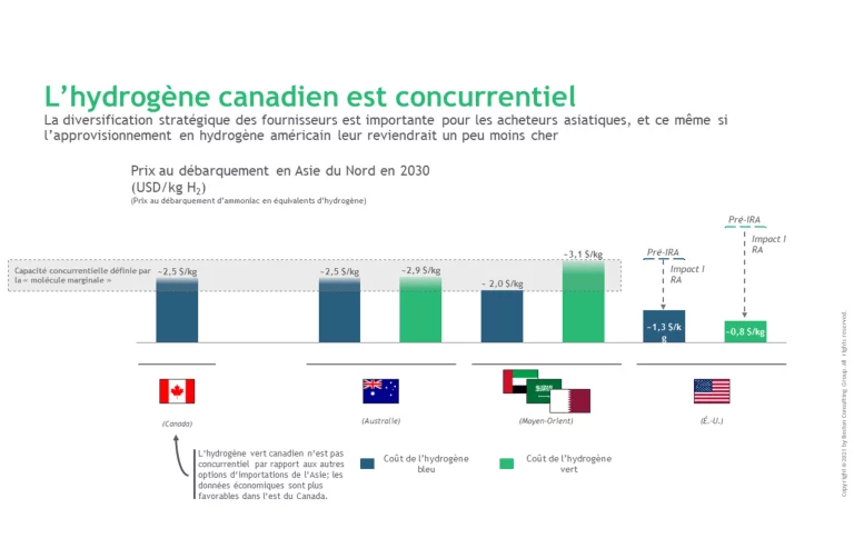 Cela ne signifie pas pour autant qu’il n’y aura pas de place pour l’hydrogène canadien : les importateurs asiatiques accordent trop d’importance à la diversification des fournisseurs pour cela. Le marché du gaz naturel liquéfié offre à cet égard une étude de cas révélatrice, dans laquelle nous pouvons voir notamment que le Japon importe délibérément de neuf pays différents pour accroître la sécurité énergétique. Il en ira de même en ce qui concerne l’hydrogène. Le Japon et la Corée du Sud choisiront d’importer de pays autres que les États-Unis, et notamment des territoires où le Canada est concurrentiel en ce qui touche les coûts.