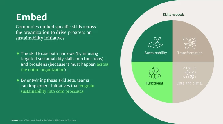 Phase II: Embed. As they move forward, companies need broader sustainability fluency. Guided by the core team of general athletes and experts established in the mobilize stage, firms must embed sustainability skills across the organization in order to deliver on the sustainability initiatives within their business units and functions. Talent must still be multidisciplinary, but the emphasis should be on integrating the sustainability skills and the functional skills required to operate within the business units (sustainability skills plus procurement skills, for example, to achieve scope 3 reduction goals in the course of supplier relationship management). Depending on the job, the relative mix of the four skills will vary, but functional and sustainability skills will always be the bedrock.