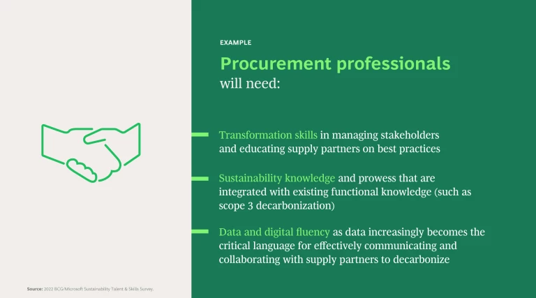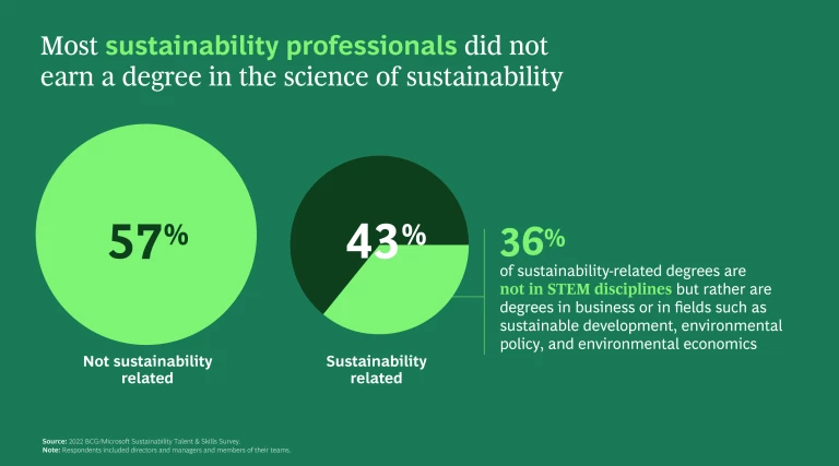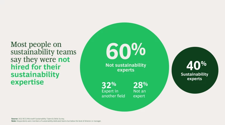 The fact that just 17% of companies are on track to meet their emissions targets reflects the enormous amount of work that is yet to be done to turn ambition into action—which points to a looming challenge: Do companies have the talent they need to pull it off? Turns out, it’s hard to acquire the expertise required to plan, let alone implement, sustainability transformations. According to LinkedIn, the number of job postings that include sustainability skills grew by 8% per year from 2016 through 2021, but the number of people with those skills increased by just 6% annually over that time period. Consequently, job searches that target sustainability experts often come up empty. The same is true when companies seek functional talent with fluency in key sustainability topics. “Procurement people with sustainability knowledge just don’t exist,” one executive we talked to explained.