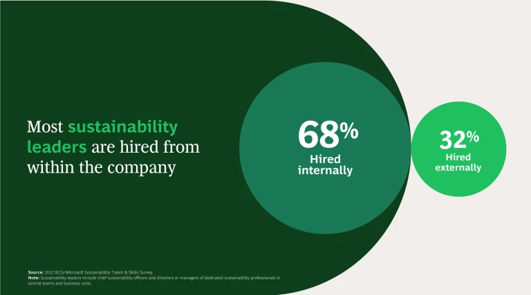 While the merits of hiring internally are clear, companies also have the opportunity to augment their talent strategy with a plan to expand the core team through external hires, particularly when specialized or technical sustainability expertise is required. Companies report doing this early in the sustainability process for new requirements. Microsoft, for example, has hired externally to meet the need for carbon accountants. “We look for people who have managed carbon accounting at another company because it’s not always obvious how to do it if you haven’t already,” the company’s general manager of energy and resources explained.