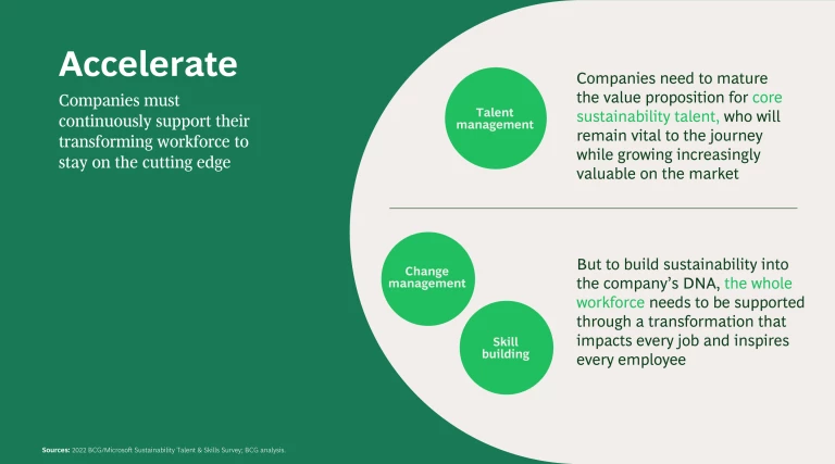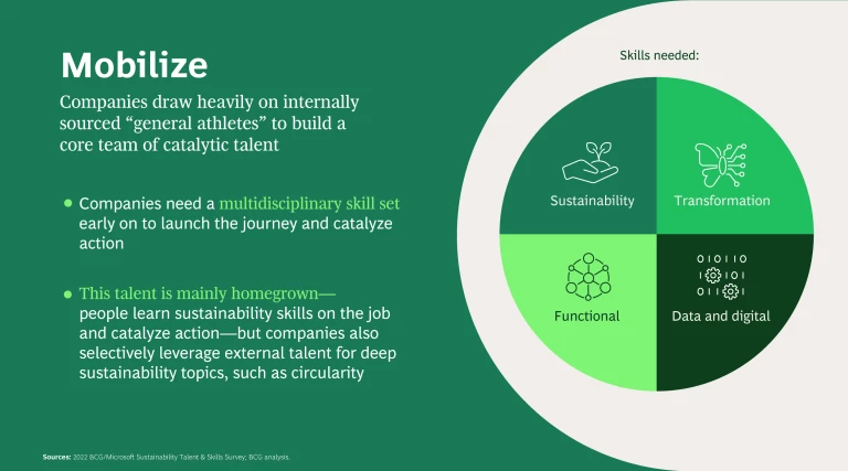 As a result, our research showed, front-runner companies are meeting the multidisciplinary skill set challenge by developing talent internally. They select employees with the necessary functional, transformation, and data and digital expertise to become members of the mobilization phase team and then help them rapidly gain sustainability expertise. (The reverse is harder to engineer. As Microsoft’s general manager for energy and renewables explained, “The challenge in finding really impactful people in this space is to find someone who’s focused very deeply on a particular aspect of the business before becoming a sustainability professional.”)