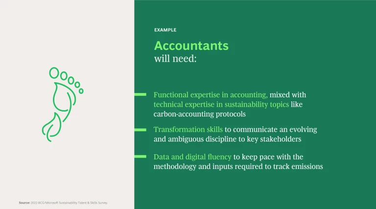 Beyond those transformation superpowers, all sustainability-focused professionals, of course, need sustainability skills. They also require data and digital skills, for two reasons: Because they’ll need this language to communicate with organizational stakeholders about sustainability goals, and because they’ll spend a great deal of time measuring and demonstrating progress against those goals. And core sustainability-focused talent needs to operate from a functional understanding of how the organization works and how it creates and captures value.