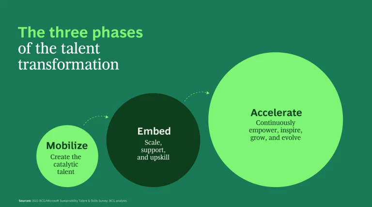 In the first phase of building sustainability talent, companies will assemble their sustainability evangelists, who will not only make progress on sustainability but also show a wider population of employees how to embed sustainability into their roles, helping gain the buy-in of leaders and their teams from across the company and acting as agents of change for sustainability.