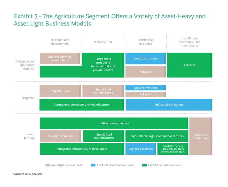 Due to the size of physical assets and capital required, many of the business models along this sector’s value chain are asset heavy, although companies focusing on distribution and sales as well as systems installment and maintenance offer business models with lower asset intensity. (See Exhibit 5.) Especially attractive opportunities include biological crop stimulants and protection, irrigation and farming infrastructure, and indoor and vertical farming. These areas offer the potential for product- and sales-mix innovation and commercial expansion into new geographies and new sales channels such as e-commerce platforms, as well as greater efficiency and economies of scale.