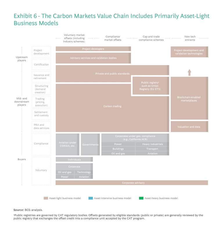 This category’s value chain offers an especially wide variety of asset-light business models with high scalability, given their considerable reliance on digitization. (See Exhibit 6.) And many offerings in the category should be scalable across geographies and a variety of carbon credit-producing environmental processes. Core value creation opportunities include carbon financing consultancies and portfolio managers, exchanges, ratings agencies, project development and carbon credit producers, and monitoring, reporting, and verification (MRV) entities.