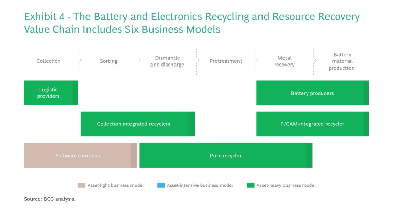 Three business models in particular offer high value-creation potential—battery collectors and aggregators; pure players focusing on recycling of the lithium, nickel, cobalt, and manganese in Li-ion batteries; and precursor cathode active material (P/CAM)-integrated recyclers. All of these are seeking growth by moving up and down the value chain. (See Exhibit 4.)