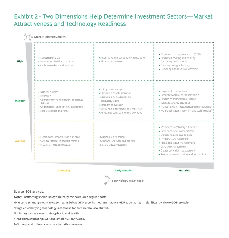 First, investors will need to identify the most attractive subsectors that align with their investment approach. Exhibit 2 lays out the landscape of C&S investment opportunities along two criteria: market attractiveness and technological readiness.