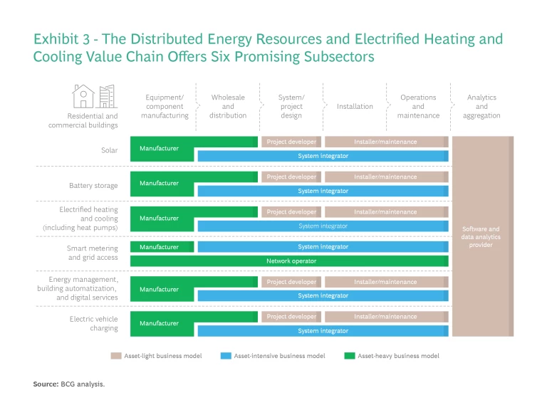 While some investors will likely be willing to support companies involved in manufacturing and network operations, the sector also offers a variety of asset-light business models along the value chain. (See Exhibit 3.) For example, companies could develop a software-as-a-service (SaaS) product that offers demand-side customers the ability to comprehensively monitor and manage their energy consumption.