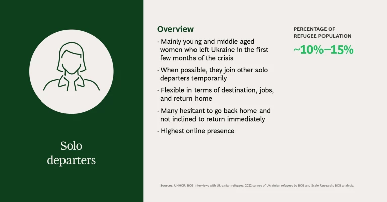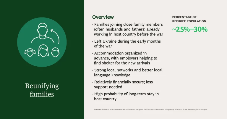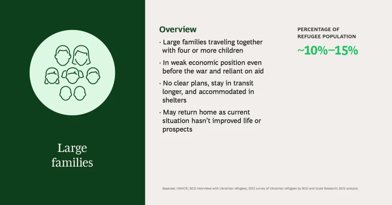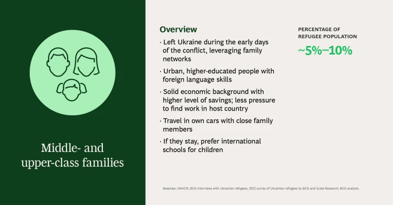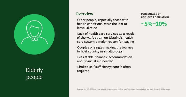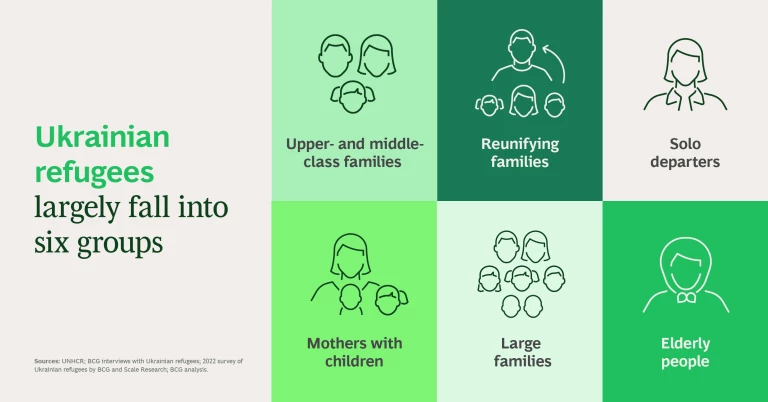 Ukrainian refugees can be largely segmented into six groups, according to BCG research, each with distinct characteristics and needs. They are upper- and middle-class families; reunifying families (often wives and children joining spouses and fathers working in host country before the war); solo departers (mainly young and middle-aged women); mothers with children; large families; and elderly people. (See the slideshow.)