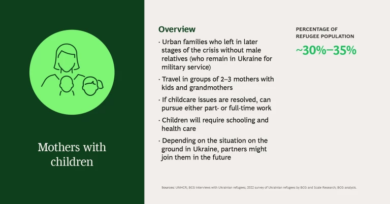 Childcare. Because many Ukrainian refugees are mothers with young and school-age children, they can only go to work if some form of child daycare is available. Even with the provision of childcare, family responsibilities will make holding full-time jobs impossible for many women.