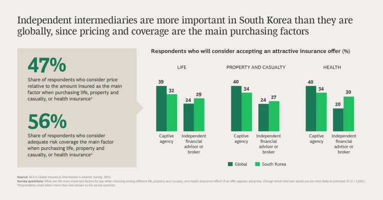 South Korea, China, and the US. In South Korea, we find that the typical respondent prefers using independent intermediary channels (specifically the general agency channel), rather than employing a captive agency. As a result, insurers’ agency channels are struggling with downsizing and with agents leaving for the general agency channel. To gain a foothold in the rapidly growing general agency channel and to retain agents, insurers are entering it directly or indirectly—through acquisition or investing.