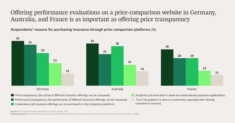 Germany, Australia, and France. In Germany, service calls are particularly effective; in fact, about 50% of Gen-Z respondents in Germany have bought additional insurance products through a service phone call. And we find that German, Australian, and French respondents have something in common: they think that insurers offering performance evaluations on a price-comparison website is just as important as offering transparent pricing.