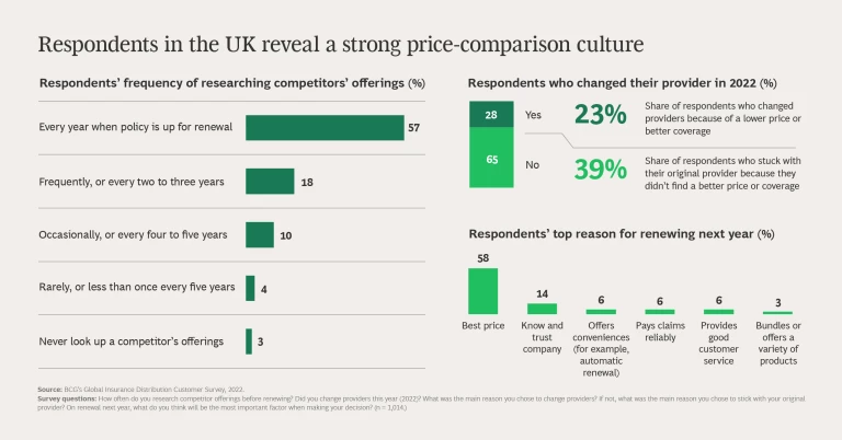 The UK. In the UK, we find a truly powerful price-comparison culture. In fact, the average UK respondent compares three or more offers before buying insurance, and more than half said that the price is the most important factor in their decision to renew their insurance in 2023.