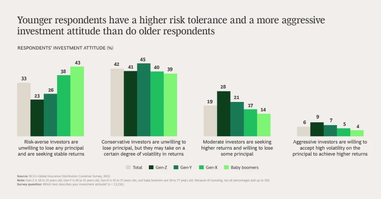 Segment Differences. Insurers should develop more tailored products and services to satisfy the strong demand of wealthy customers for life, health, and personal liability insurance, as well as for life insurance savings accounts. In addition, given that younger generations have a higher risk tolerance and expect to get higher returns with appropriate risk, insurers could offer these customers unit-linked insurance plans, which provide a combination of insurance coverage and investment exposure via equities or bonds.