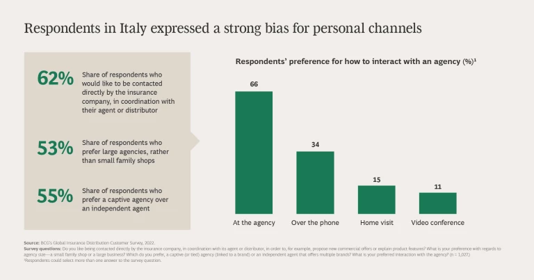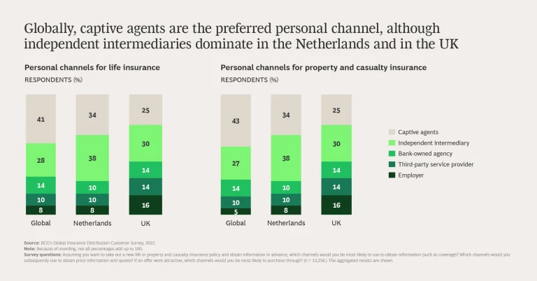 Omnichannel journeys are becoming the norm worldwide; many insurance customers are moving easily between online and offline interactions. Personal channels are still the most popular, especially for purchasing a policy. Captive (or tied) agents tend to dominate that category, although independent intermediaries are gaining traction in many countries. But digital channels are growing in popularity. More than a third of respondents said that they prefer collecting and comparing quotes online, and they would rather perform research digitally than by interacting with an agent in a call center.