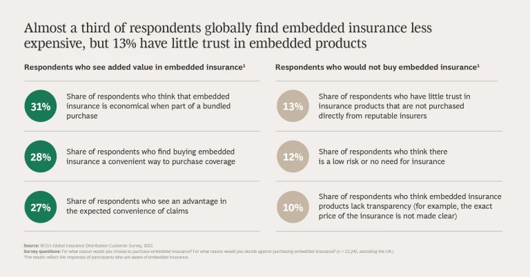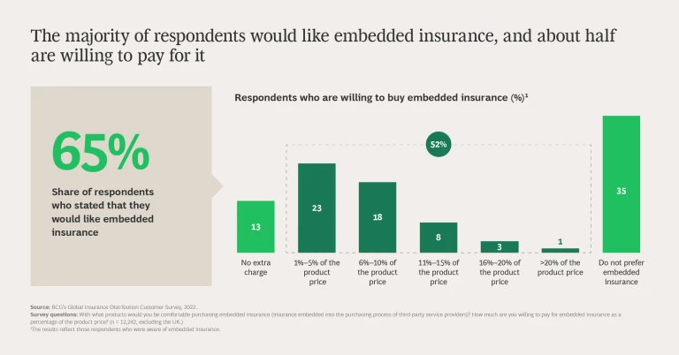About 65% of respondents globally (excluding the UK) said that they would purchase embedded insurance—policies that are included in or added to the item purchased. For example, airlines often offer customers cancellation insurance when they are purchasing tickets. Younger generations are particularly interested in embedded insurance, with 84% of Gen-Z and 75% of Gen-Y respondents saying that they would buy such a product. And 52% of non-UK respondents who are aware of embedded insurance said that they are willing to pay for it, although the amount they would pay varies from just 1% to more than 20% of a product’s price. At the same time, about 13% of those surveyed said that they have little trust in embedded products, preferring to purchase directly from reputable insurers. (See the slideshow “Innovation Readiness.”)