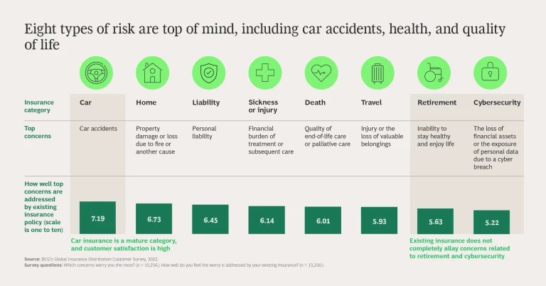 Insurance customers everywhere are avoiding risk more and more, largely owing to concerns about an uncertain future. Top-of-mind risks for respondents are car accidents and property damage, as well as potential health care costs and the quality of end-of-life care. In addition, many respondents expressed concern about retirement risks and cybersecurity, saying that their existing insurance does not fully allay their concern.