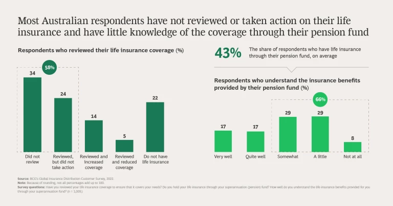 Australia. For 39% of Australian insurance respondents, we find that an offer of loyalty or rewards programs is likely to have a positive impact on purchasing decisions. This is especially true for younger and wealthier buyers. Fifty-six percent of Gen-Z respondents and 71% of affluent-plus respondents are likely to be influenced by such offers. Separately, most respondents in Australia do not review the life insurance bought by their pension fund or take any action on the related coverage—even though nearly half of those surveyed (and 66% of the affluent plus, specifically) have purchased their life insurance through these funds.