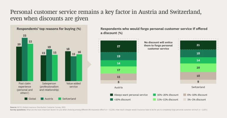 Austria, Switzerland, and Italy. In Austria and Switzerland, we find a strong preference for personal customer service, with more than 20% of respondents stating that no discount would be enough to persuade them to use a different channel. This feeling is especially strong among the baby boomers (42% of the respondents in Austria and 34% in Switzerland). Similarly, Italian respondents have a strong preference for personal interactions, with 66% saying they would prefer to go to an agency than interact over the phone or on video.