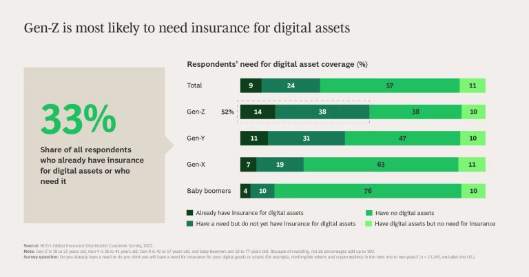 It seems that younger generations—Gen-Z and Gen-Y (ages 18 to 25 and 26 to 41, respectively)—are the most open to innovation in their insurance interactions and products. They are the most likely to purchase insurance from a virtual insurance agency in the metaverse (a virtual reality space) and to buy insurance for digital assets, such as cryptocurrencies. Although just 18% of respondents worldwide said that they can imagine purchasing insurance in the metaverse, 30% of those in Gen-Z and 25% of those in Gen-Y are willing to do so (excluding US respondents). Meanwhile, more than half of Gen-Z respondents said that they need insurance for digital assets, compared with 33% of respondents globally (excluding those in the US).
