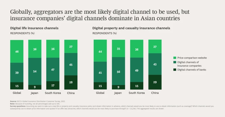 Among digital channels, price-comparison websites, or aggregators, tend to dominate globally for both life and property and casualty insurance, with respondents preferring to use them over the individual digital channels of insurance companies or banks. Respondents in Japan, South Korea, and China, however, tend to prefer the digital channels of insurance companies. (See the slideshow “Omnichannel Prevalence.”)