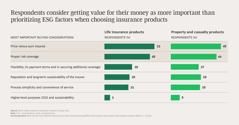 Sustainability, in contrast, does not rank highly among buying factors. Forty-six percent of those surveyed said that environmental, social, and governance (ESG) factors and sustainability are important to them. However, only 5% choose ESG factors as the most important criteria when buying life insurance, and only 8% cite it as an important factor when purchasing property and casualty insurance. Sustainability has a long way to go before truly affecting purchasing decisions.
