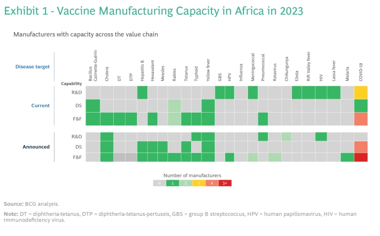 To build this ecosystem, Africa can leverage the capabilities of the 13 operational vaccine companies and organizations across the continent. While two companies are limited to distributing vaccines, eight have fill and finish (F&F) capacity, five possess capabilities for manufacturing drug substances (active pharmaceutical ingredients), and three conduct R&D. Currently, these facilities produce vaccines for six different antigens.