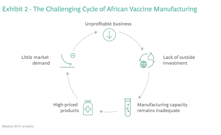 Business Model Sustainability. Most of the African vaccine manufacturers we interviewed said that they are not profitable. Historically, their operating costs have been higher than those of established developing country vaccine manufacturers (DCVMs). This has fueled a challenging cycle. Without a positive bottom line, African manufacturers have been unable to attract the outside investment necessary for building larger plants that can produce at scale. As a result, these companies are unable to compete on price and create substantial market demand for their products, and so the business model is unsustainable. (See Exhibit 2.)