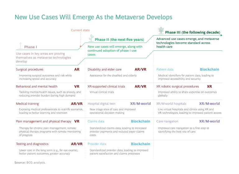 Our research suggests that the metaverse in health care is developing in three phases. We are currently moving from phase one, the period of initial experimentation, to phase two (the next five years or so), which will be defined by the broader adoption of current use cases and the emergence of new use cases as technologies advance. Phase three (the following decade) will see the development of more advanced use cases and the establishment of metaverse technologies across many areas of health care. (See the exhibit.)