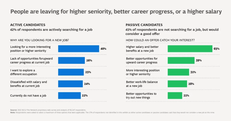 - Active job seekers care mostly about higher seniority, greater responsibility, or the chance to explore a new profession. They are motivated by the content and scope of the prospective job itself.