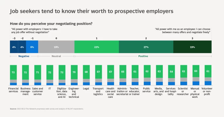 Job candidates, well aware of how many opportunities they have, tend to be confident of their value and bargaining power. Most people (68%) feel that they are in a strong negotiating position when looking for a job (that is, they believe they have more power than prospective employers). Only 14% feel that employers hold the reins in negotiations. Confidence is highest among those who work in finance, business, and sales and lowest among manual workers, nonprofit workers, and volunteers.