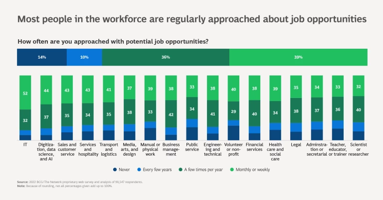 At the time of our survey, 74% of respondents said that they are approached multiple times per year about job opportunities—in fact, 39% said that they are approached every month. Even if a future recession lowers the temperature of the talent market, employers probably won’t see an abundance of talent in the short term, especially in high-demand fields. (See “Market Insights.”)