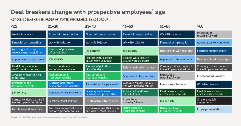 - For the youngest generation, learning and development opportunities are very important, but this attribute gradually decreases in importance as respondents age, and respondents older than 40 don’t cite it among their top ten deal-breaking concerns overall. Although this doesn’t mean that older workers will resist learning new things if they have to, the decreasing motivation to learn may pose a challenge, given the masses of people who will need to continuously reskill and upskill to keep pace with new workplace demands for AI, sustainability, and other skills.