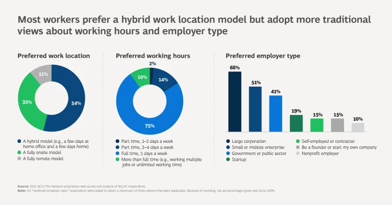 For employers, it’s a critical business decision. But underlying that business decision is the crucial need for people, which makes the personal preferences of job seekers highly relevant to the business. Despite a possible economic slowdown, global unemployment remains low and employers still feel the impact of the Great Resignation. It’s not easy to win over top talent, especially in high-demand fields. Increasingly, a lack of suitable people creates a bottleneck that impedes business growth—thus elevating the talent issue to the C-suite level.