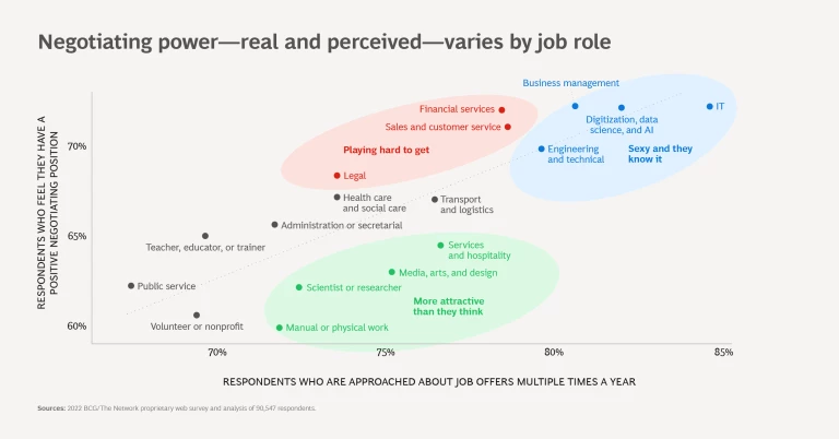 The correlation does not always hold, however. Many candidates in finance, sales, and law are “playing hard to get.” They believe that they have the upper hand, but the frequency with which they are contacted about job opportunities does not back up that confidence. On the other hand, service, media, science, and manual workers are “more attractive than they think.” They receive a relatively large number of invitations but are less confident about their negotiating power.