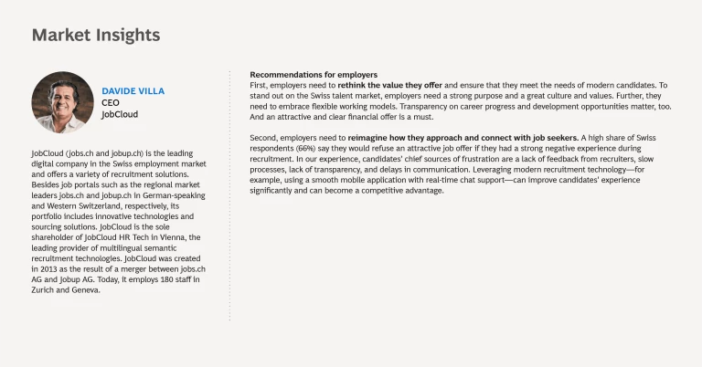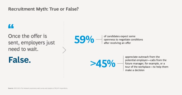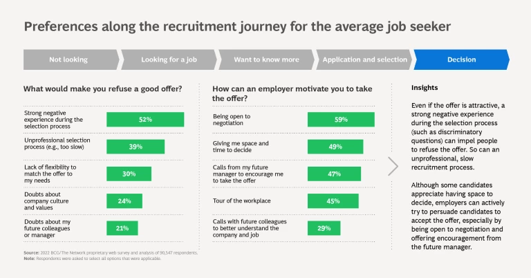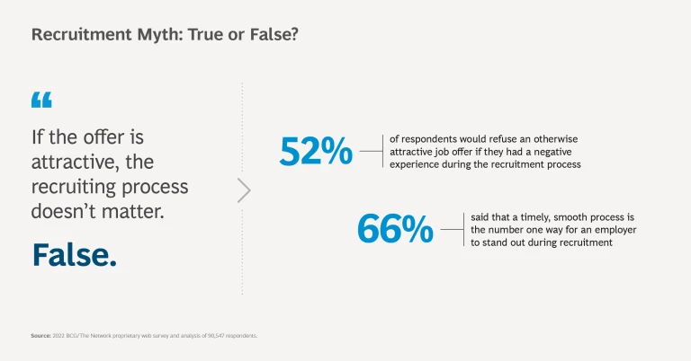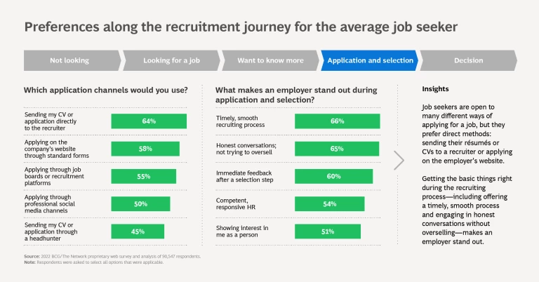 Reimagine recruitment as a personal journey. Our data shows that job candidates’ impressions during recruitment have a bigger influence on their decisions than employers may think. Nevertheless, many companies continue to manage recruitment as a corporate process, optimized for administrative requirements and legacy systems and not for creating a positive and persuasive experience for prospective employees. Best-practice employers apply a zero-based process design, stripping the process down to the essential steps and focusing on the value add for the candidate.