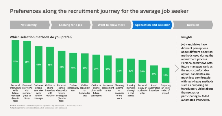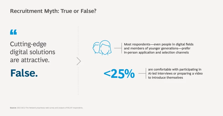 Wield digital tools impactfully—but selectively. Although the digital HR market is booming, our survey found that candidates do not want digital solutions to replace personal contact. Most people today wouldn’t be comfortable being interviewed by an AI entity in place of a human interviewer or talking to a chatbot about the recruitment process. This doesn’t mean that employers should stick to brick-and-mortar processes. Digital alternatives can work well for non-candidate-facing HR tasks (a strong applicant-tracking system, for instance, or AI-enhanced résumé screening). They can also work for certain candidate-facing tasks, such as automated interview updates or app-based preparation tips. There are also some situations where a gain in efficiency may justify a potential tradeoff in candidate satisfaction. In fact, digital tools can help deliver on some of the things that prospective employees want to see in the recruiting process, including prompt responses, clear communication, and well-defined timing.