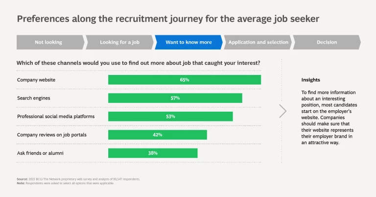 A bad recruitment experience can torpedo even an exceedingly attractive job offer. In our survey, 52% of respondents said that they would refuse an otherwise attractive offer if they had a strong negative experience during recruitment. It’s important for would-be employers to understand a candidate's ideal recruitment journey at each step of the way.