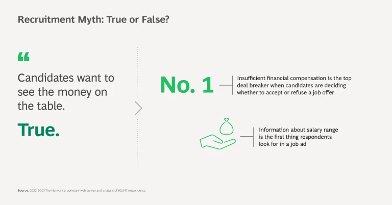 This type of candidate-centric design should identify moments of truth when trust can be built. Many of our survey respondents cited a desire for honesty about the role itself and the financial compensation that comes with it, along with continued contact (rather than being “ghosted”) and feedback on their progress along the recruitment journey. Other ways to create trust include a genuine conversation about the potential manager’s own experiences, a chat over coffee with future colleagues, and a walk on the shopfloor.
