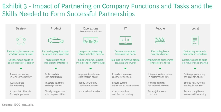 To adapt to the SDV partnering-first environment, companies must approach joint efforts using different criteria than in the past. Since these relationships are likely to be long-term, high-profile, and deeply collaborative, companies need to check their cultural and strategic alignment. This will help ensure a mutually beneficial environment where quality standards and employee values match. Partnerships should be designed as being among equals, even while unambiguously portioned to establish clear ownership of deliverables and responsibilities. Moreover, to build successful partnerships, all key functions of the organization must be involved. (See Exhibit 3.)