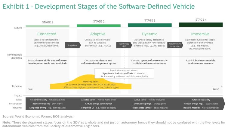 In each phase of the SDV’s evolution, complexity will increase, and innovation will come at a premium. Automotive and technology companies must partner to unlock the benefits of scale and speed-up the transition to software-defined vehicles. Equally so, the ground is still shifting, and determining which companies and sectors will add the most value and reap the most rewards will be an ongoing industry challenge. With each stage of SDV development, the dynamics will change, and the industry will almost certainly look a lot different from today. To provide clarity for strategic decisions going forward, the World Economic Forum’s Automotive in the Software-Driven Era initiative, launched in collaboration with BCG, envisions four development stages for the SDV. (See Exhibit 1.)