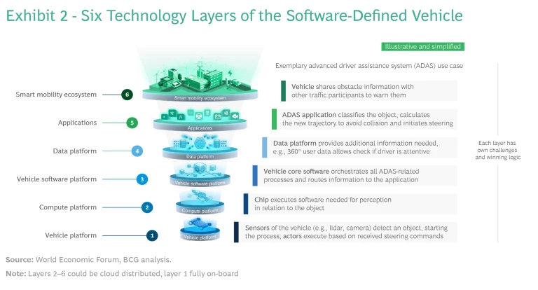 Aligning on a joint cross-industry understanding of the parts, features, and functions of a software-defined vehicle must be the first step towards efficient and shared innovation. To enable automotive and tech companies to speak the same SDV language, the thirty-plus automotive, technology, and mobility industry leaders taking part in the Automotive in the Software-Driven Era initiative created a six-layer model of a software-defined vehicle. This can help provide structure in future developments and collaborations. (See Exhibit 2 for examples of the activities that each layer supports, from bottom to top.)