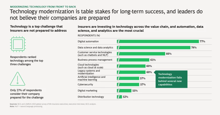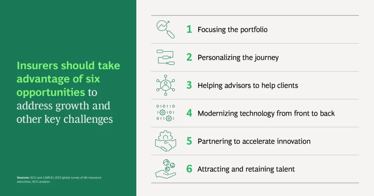 Insurers’ opportunities and challenges are creating a pivotal point for the industry, and leaders are already taking action. We’ve identified six key opportunities that insurers can take: focusing the portfolio, personalizing the journey, helping advisors to help clients, modernizing technology from front to back, partnering to accelerate innovation, and attracting and retaining talent. By being proactive, insurers can make the most of today’s robust consumer demand.