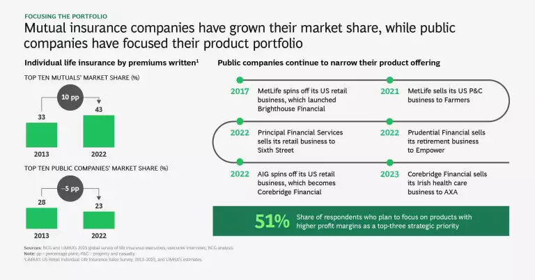 Meanwhile, interest rates and the yields on ten-year US Treasury notes are back at levels not seen since before the global financial crisis, creating an attractive environment for insurers to grow in the US. The top ten mutual insurers are in a particularly good position after expanding their share of the life insurance market by 10 percentage points from 2013 through 2022. They now control about 43% of the market.