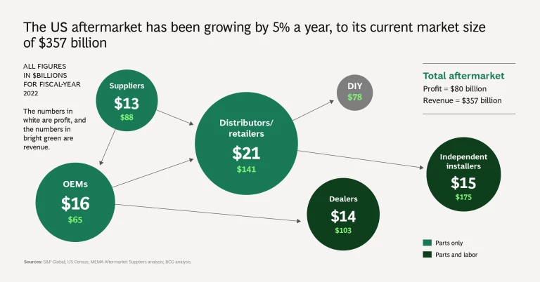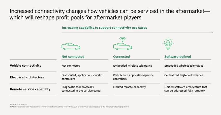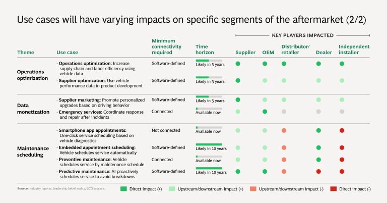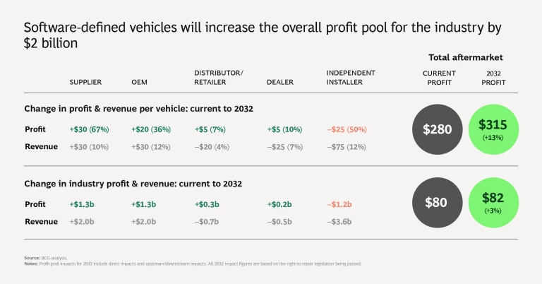 - As much as $4 billion in profit shifts along the value chain will be up for grabs by 2032. But the growth opportunities won’t be evenly distributed across the aftermarket value chain. Automotive OEMs and their suppliers will be best positioned to capture value because connectivity will give them greater direct access to customers—especially if regulators fail to enact “right to repair” laws that open systems to outside app developers and service providers. Brick-and-mortar dealerships face the most risk of lost business.