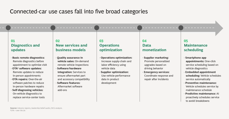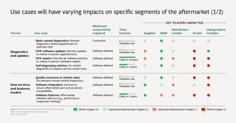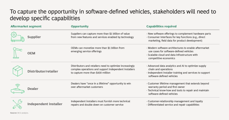 For answers, BCG collaborated with the MEMA Aftermarket Suppliers to study the implications of software-defined cars on the major segments of the US automotive aftermarket—parts suppliers, original equipment manufacturers (OEMs), distributors and retailers, independent installers, and dealerships. For each, we assessed five categories of opportunities: diagnostics and updates, new services and business models, operations optimization, data monetization, and maintenance scheduling. With a rigorous and thoughtful approach to building the new capabilities required to tackle these use cases, aftermarket players have a once-in-a-generation opportunity to capture these profit pools. An overview of our findings is included in this slideshow: