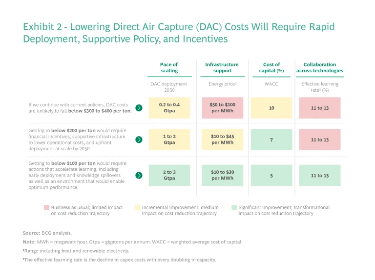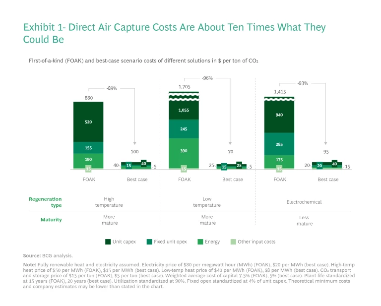 BCG has modeled the greenhouse gas abatement cost curves for many industries and companies. While reducing the first 60% to 80% of emissions is very affordable for most organizations (assuming sufficient access to renewables and other existing technologies), reducing the last 20% to 40% is very expensive—often well above $150 per ton. Tackling these final emissions will require removing many obstacles, from permitting to just transitions for local communities to a host of “not in my backyard” issues. If we are serious about a net zero world, then large-scale DAC at $150 per ton or lower should be a major part of the equation.