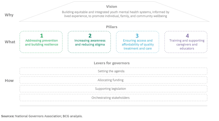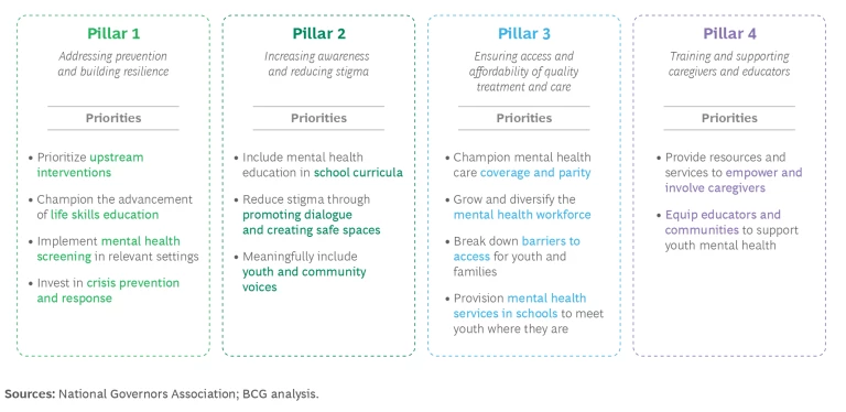 Drawing on an analysis of mental health initiatives across US states and territories, the report focuses on four core pillars for state intervention (see the first exhibit):